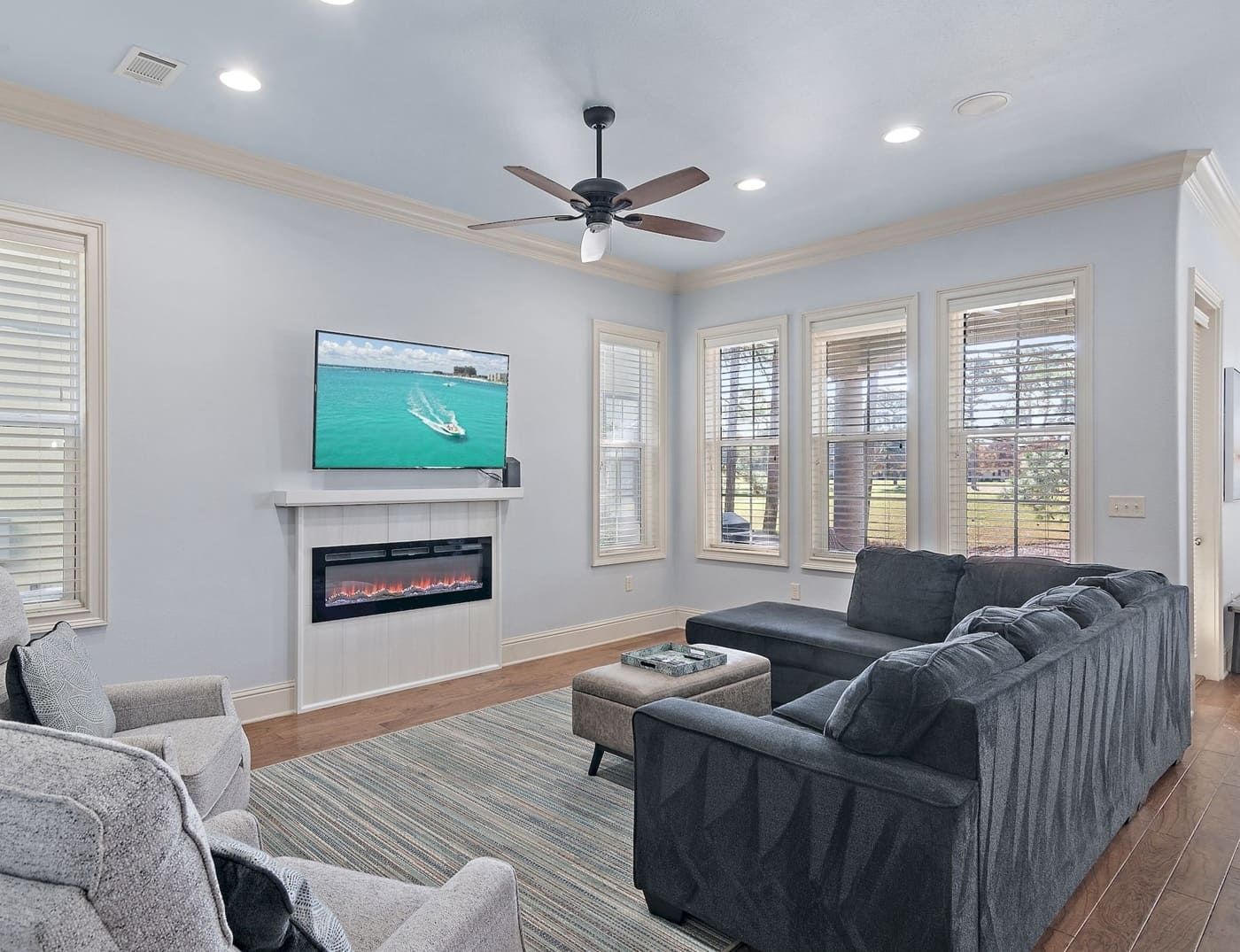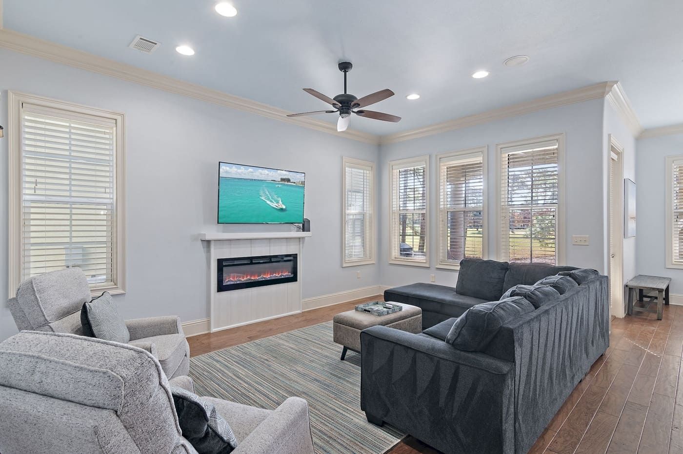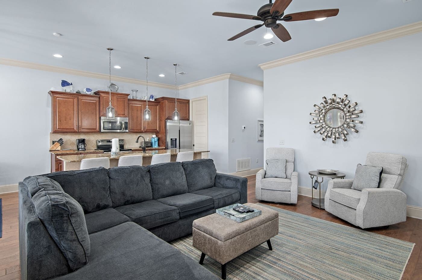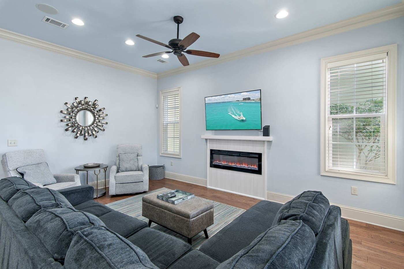The inviting living room is the perfect place to unwind after a day of exploring Sandestin. Newly updated with modern touches, enjoy the ambiance of the electric fireplace, sink into one of the two recliners, or stretch out on the sofa sectional, including a sleeper sofa for additional guests. This space is designed for comfort and togetherness, whether watching a movie, playing games, or simply relaxing.